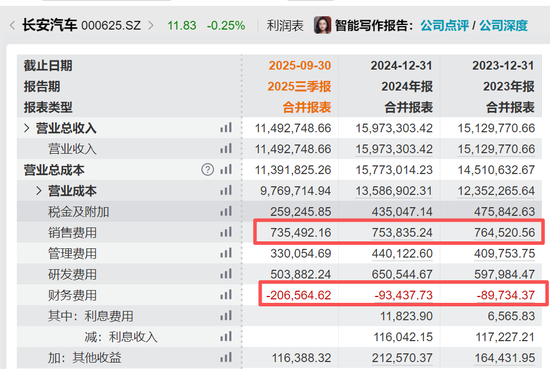 原因就是车不好卖了,基本都是营销推广或降价带来的销量增长,25年前三季度销售费用高达73.5亿,几乎和24年整年的销售费用相当。与此同时,长安汽车财务费用大幅增加,前三季度高达20亿,去年整年才9.3亿。应该很大一部分来自外汇兑付本币带来的损失,毕竟人民币大幅升值。