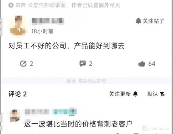 而在社区平台,不少长安汽车纷纷吐槽:对员工不好的公司,产品能好到哪去?这一波堪比当初的价格背刺老客户。