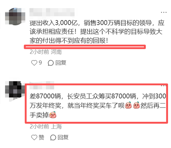 对此,有网友想到了几个办法:既然目标完成97%,是不是就应该按97%来支付年终奖?还有网友表示:差87000辆,长安员工众筹买87000辆,冲到300万发年终奖,就当年终奖买车了呗,然后再二手卖掉。