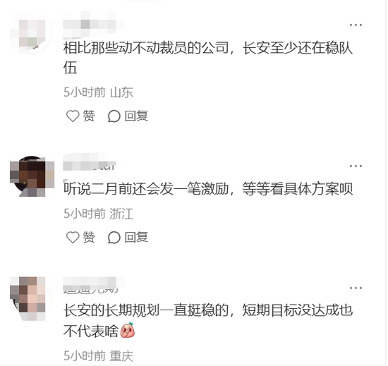 不过,也有网友表示支持长安汽车:相比那些动不动裁员的公司,长安至少还在稳队伍;听说二月前还会发一笔激励,等等看具体方案呗;长安的长期规划一直挺稳的,短期目标没达成也不代表啥;现在就业市场卷成这样,长安不拖欠工资、节假日正常休,比很多企业强太多,年终奖晚发或调整都是大环境影响,知足常乐