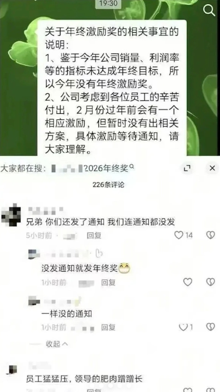 根据社区平台消息,一张聊天截图显示:鉴于今年公司销量、利润率等指标未完成年度目标,所以今年没有年终激励奖。但是,公司考虑到各位员工的辛苦付出,2月过年前会有一个相应激励,但这哪是没有相关方案,具体激励等通知。