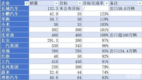 金石杂谈还看到一张来自易车网的销量图统计,2025年完成目标的目前看只有5家,分别是小鹏、零跑、小米、吉利,比亚迪则是摸着门槛达标。其次就是长安的97%。虽然说,未达标也不至于一点年终没有,毕竟年终也是员工的不菲的收入。