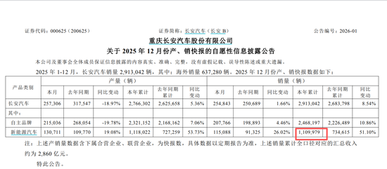 而根据年度数据,2025年全年,长安汽车总销量为291.3万辆,全口径收入约2860亿元,未达成300万辆的销量目标,完成目标的97%。不过,新能源汽车销量突破100万辆,已完成销量目标。即便没达标,整体销量也较去年同比增长8.54%。