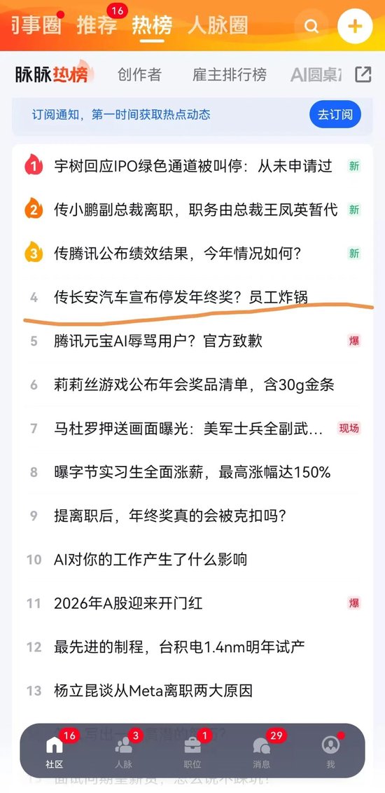 1月5日消息,今天一则消息彻底刷屏,在社区平台一条“传长安汽车宣布停发年终奖,员工炸锅”的帖子直接上了热搜榜第四名。
