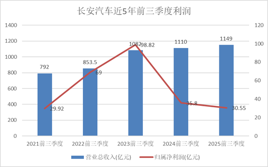 就前三季度业绩来看,长安汽车近三年利润持续下滑,虽然卖的更多了,但利润反而更少了,23年前三季度利润近100亿,24年直接下滑60%多至35.8亿,25年再度下滑至30.55亿。