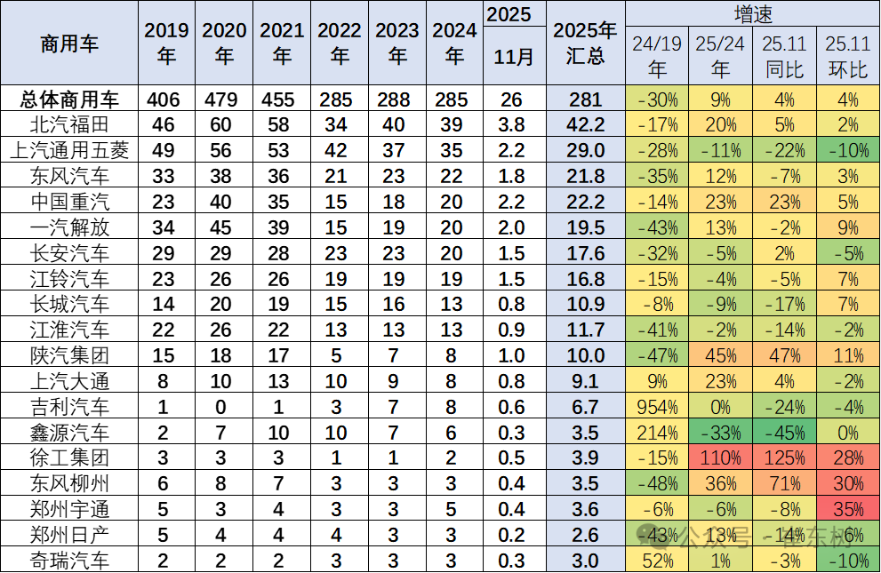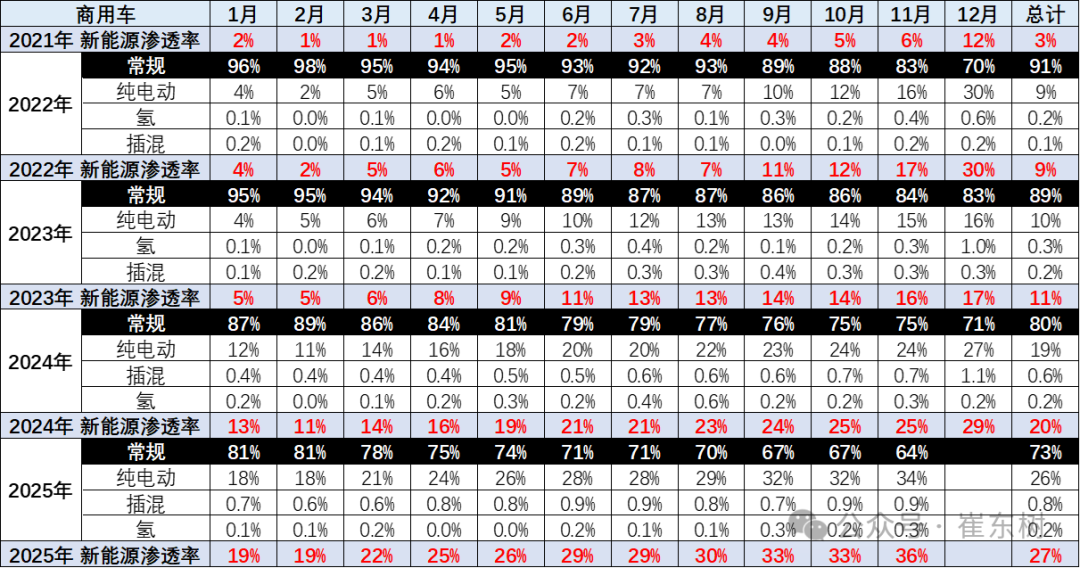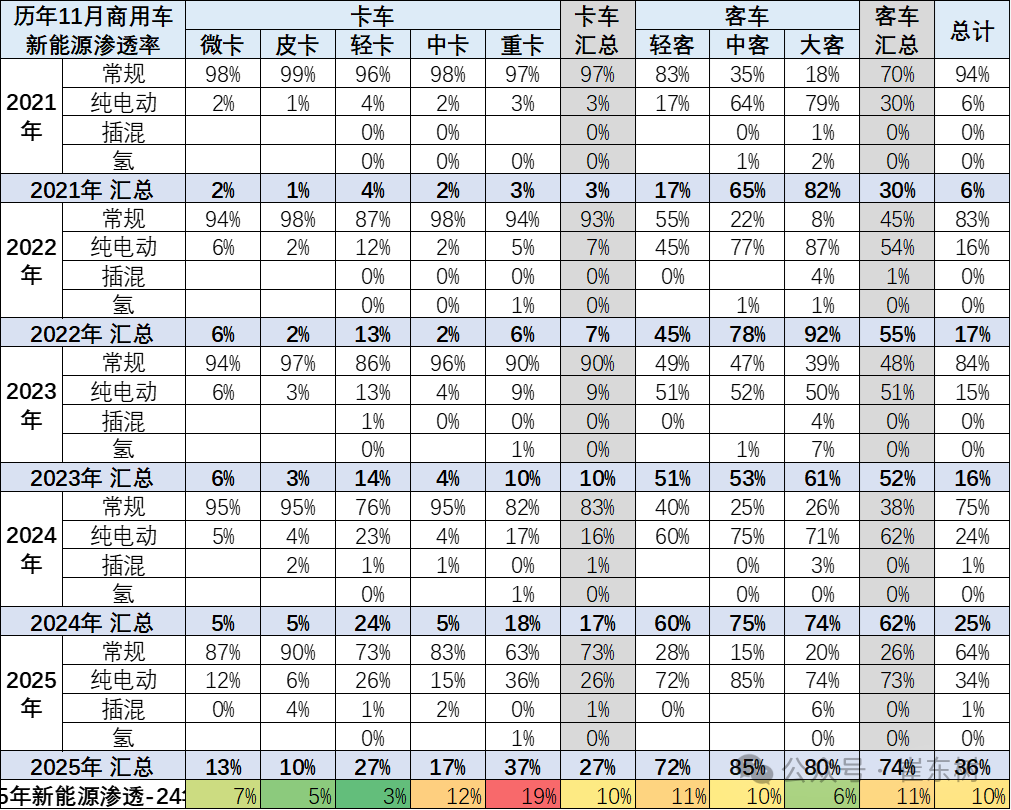 从2019-2021年,整个新能源商用车的渗透率在3%左右水平,2022年达到9%,2023年达到11%,2024年全年达到20%,2025年1-11月就达到渗透率27%的良好水平,体现了新能源商用车强势增长良好态势。
