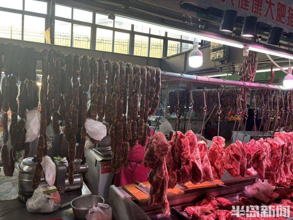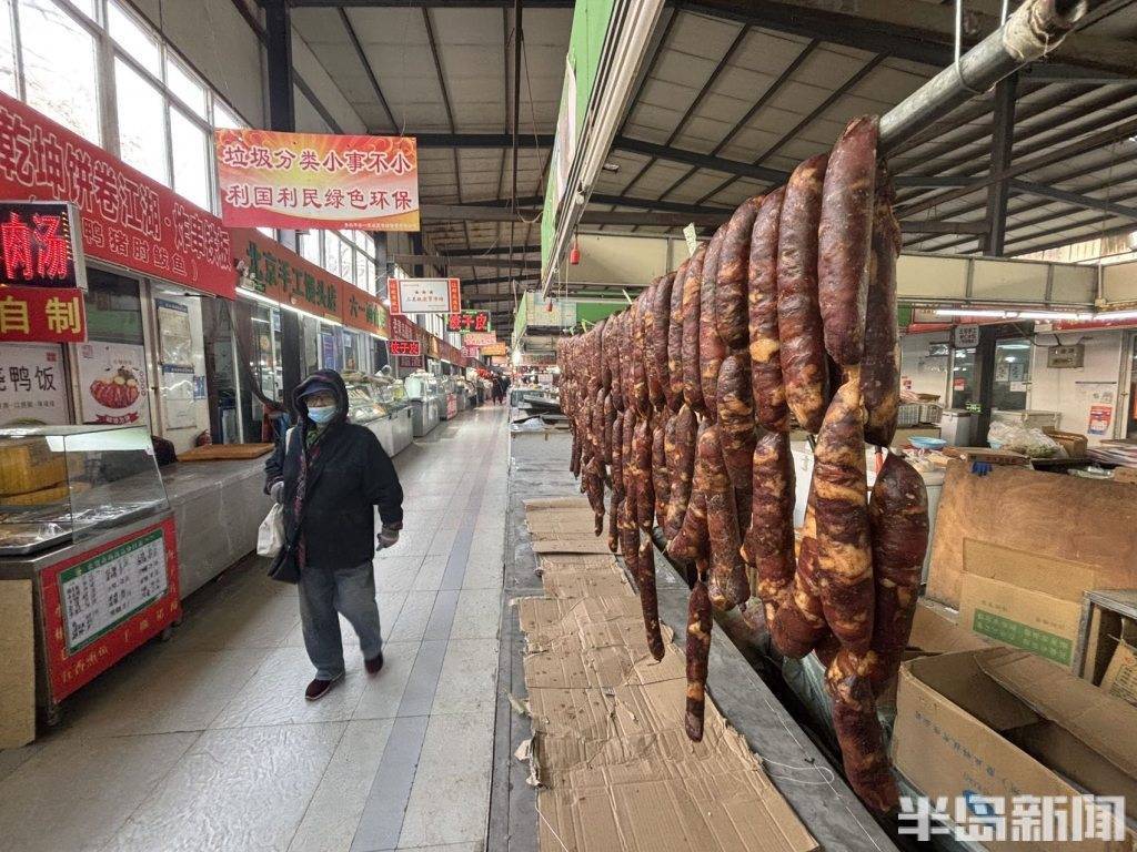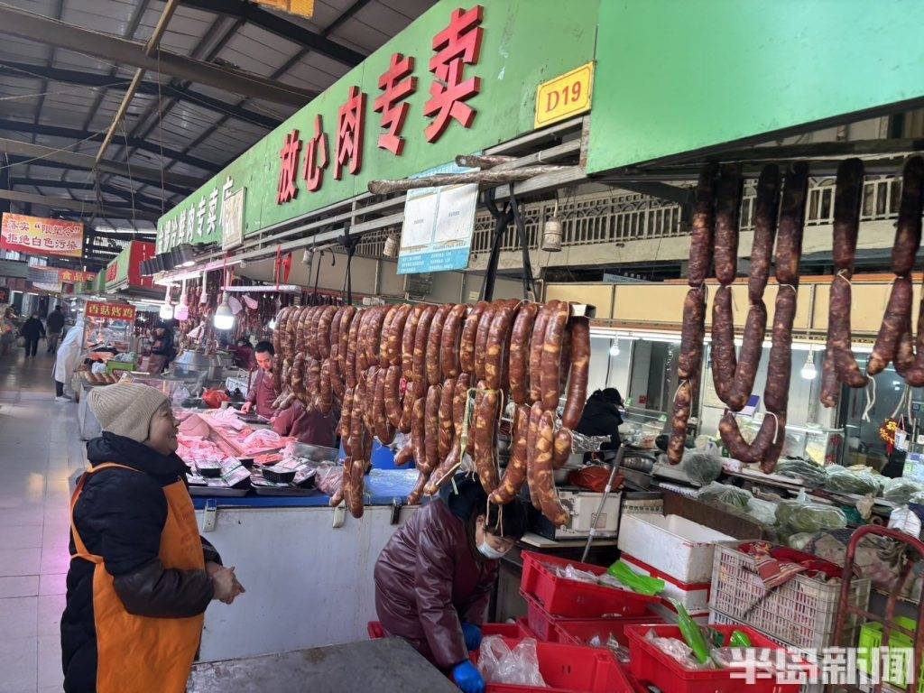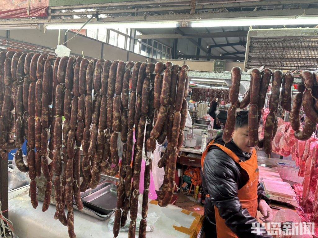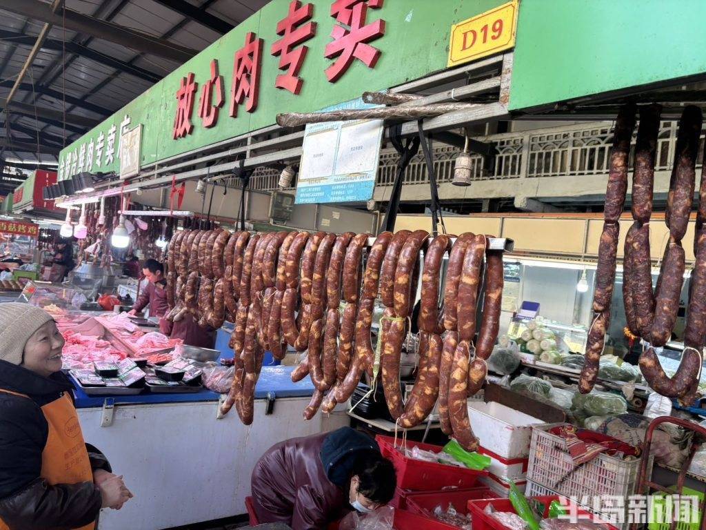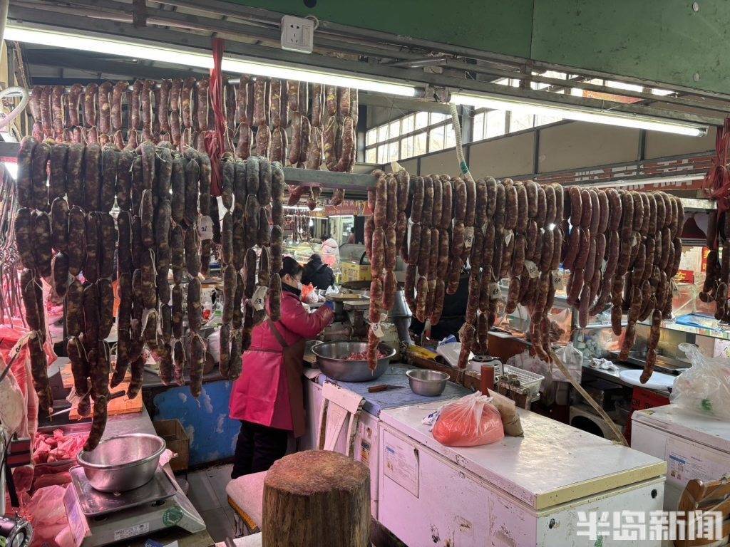 2月2日,青岛市北区平安路农贸市场内,肉铺商户正忙着整理刚灌制好的香肠,还细心为顾客预定的香肠做好专属标记。新春将至,香肠迎来消费旺季,肉铺摊位也进入了一年中最忙碌的时刻。