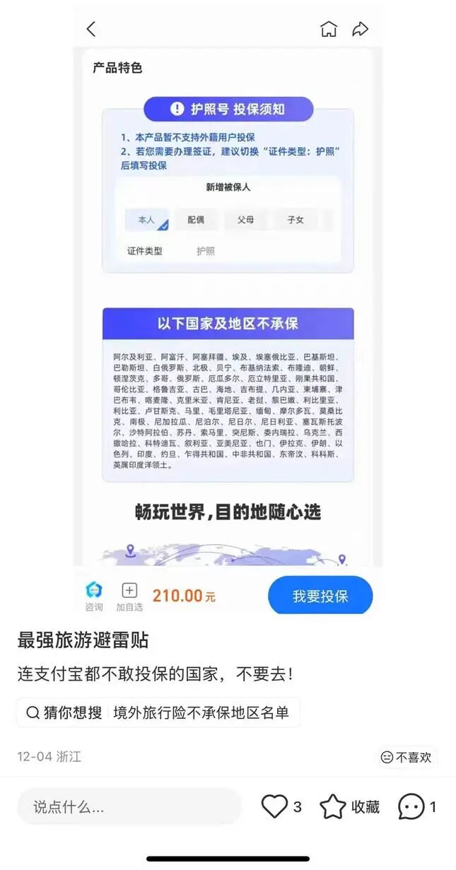 可见,此次柬埔寨事件不过是一个引爆点,用户被杀熟,损失的只是金钱,但诱导用户去高风险地区旅游,用户面对的是人身安全风险,性质大为不同。大量用户在网上贴出的图片显示,支付宝旗下的海外旅游保险,早已将包括柬埔寨在内的多个国家和地区列入“不承保或限制承保”范围。保险公司并非道德评判者,但它们对风险的态度往往是最冷静、也最现实的。当保险选择回避时,普通用户自然会反问:既然连保险都不愿覆盖,为什么一家掌握着海量用户的旅游平台,却显得如此积极?携程在这背后到底有多大的利益?