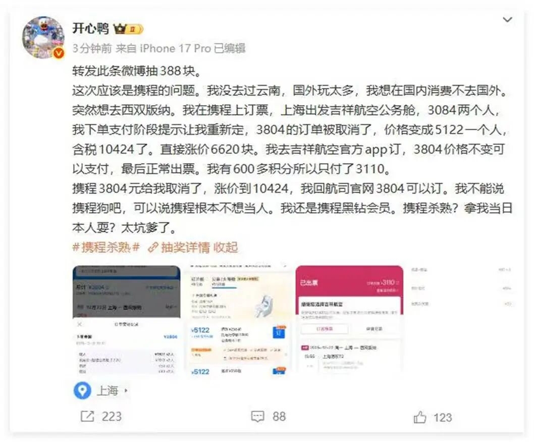 12月10日,著名黑客、安全技术专家、微博大V@开心鸭发博称,自己在携程APP下单上海-西双版纳公务舱机票,支付时订单被无故取消,价格从3804元跳涨至10424元,直接涨价6620块。作为携程黑钻会员的他随后在吉祥航空官方APP以原价3804元成功购票。开心鸭称,携程根本不想当人,拿他当日本人耍。