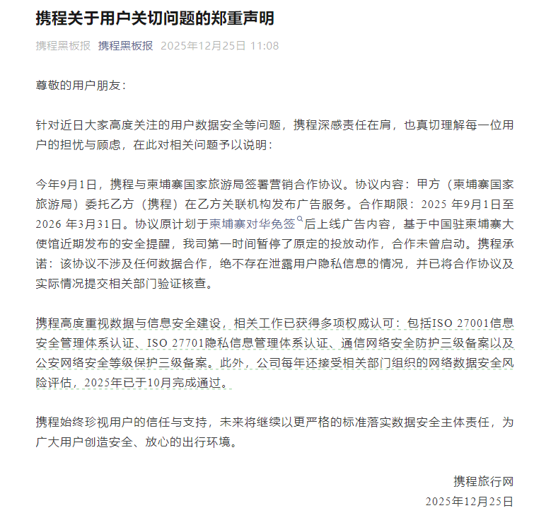 在这份并不算长、却被反复转发的声明中,携程表达了几个主要观点:首先,携程承认今年9月1日与柬埔寨国家旅游局签署了营销合作协议,合作周期覆盖2025年9月至2026年3月;其次,该合作属于广告与营销层面的委托,“不涉及任何用户数据合作”;最后,基于中国驻柬埔寨大使馆近期发布的安全提醒,原计划中的相关投放已经暂停,“合作未曾正式启动”。携程还在声明中强调,公司已通过ISO 27001、ISO 27701等多项信息安全与隐私保护认证,并已将协议提交有关部门核查。