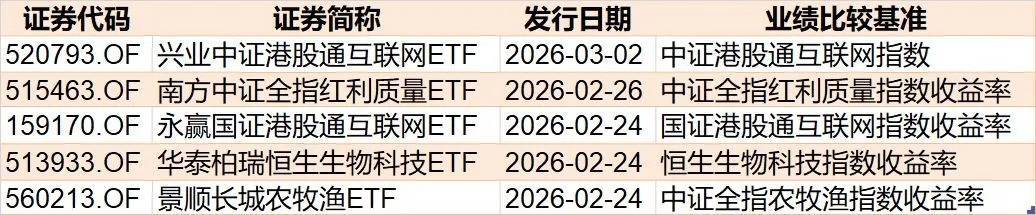 目前有5只ETF披露节后发行,跟踪标的为农牧渔、恒生生物科技、港股通互联网等。