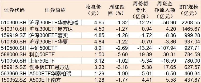具体ETF方面,规模较大的10只宽基指数ETF本周合计净流出142.48亿元,其中中证500ETF流出107.94亿元。