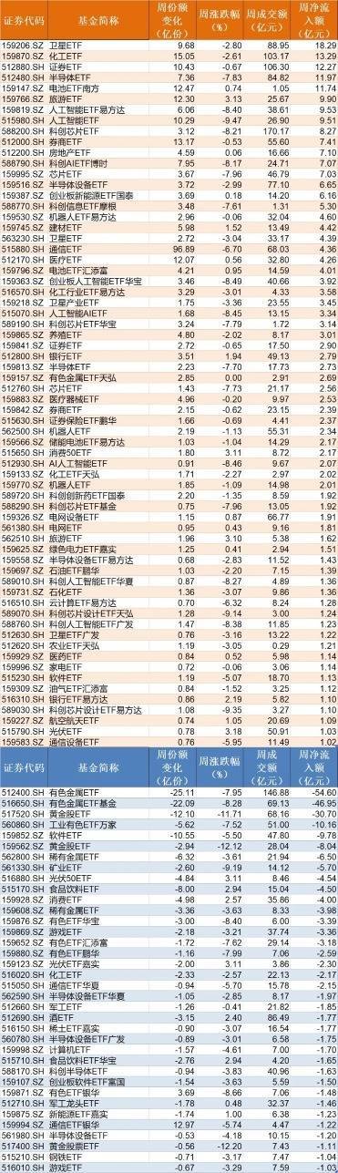 从行业主题上看,卫星、化工等ETF被资金看好,而有色金属相关ETF被资金抛售。