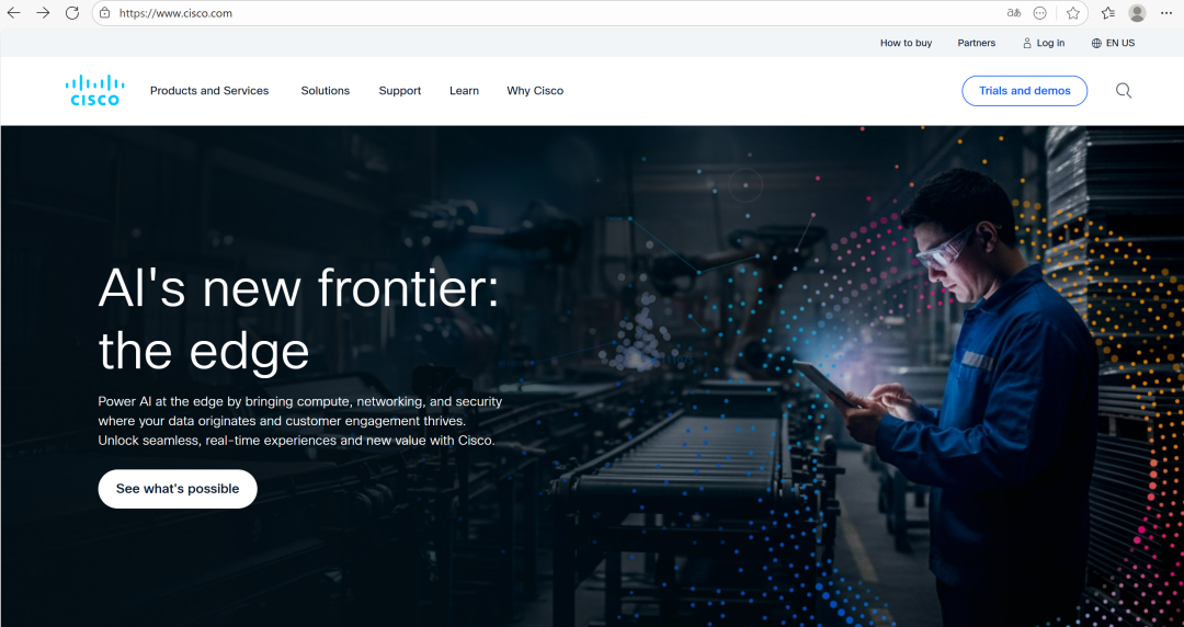 打开思科全球官网,映入眼帘的是全新的主题,AI的新前沿:边缘计算
